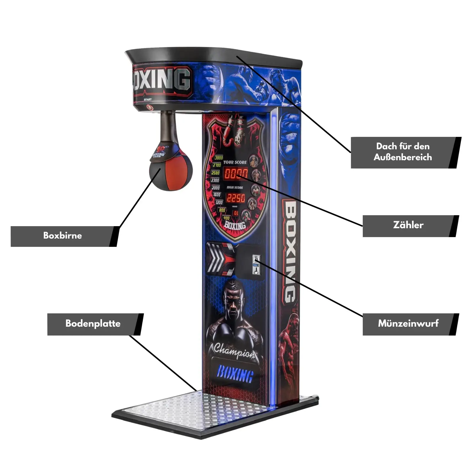 Der Boxautomat Champion kombiniert Action, Präzision und Design in einem robusten Unterhaltungsgerät. Mit seiner auffälligen LED-Beleuchtung, stabilen Konstruktion und sensibler Schlagmessung sorgt er für ein realistisches Spielerlebnis. Ideal für Spielhallen, Freizeitparks oder Events – ein echter Publikumsmagnet für alle Altersgruppen.