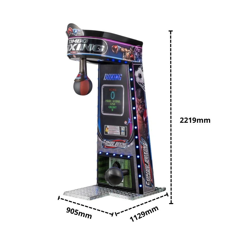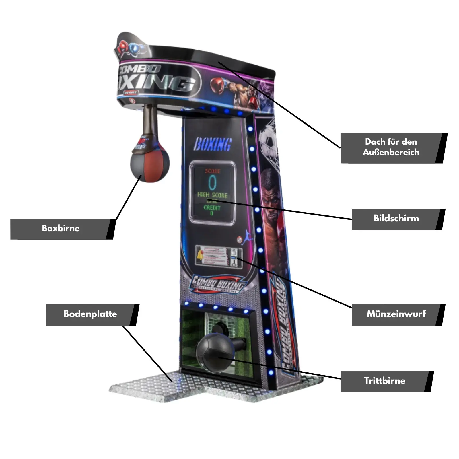 Dieser Kombi-Boxautomat kombiniert das Beste aus zwei Welten: Boxen und Kicken! Mit seiner robusten 2 mm-Stahlkonstruktion, moderner LED-Beleuchtung und digitaler Punkteanzeige sorgt er für echtes Wettkampf-Feeling – ob im Freizeitpark, auf Events oder in Spielhallen. Ideal für alle, die ihre Kraft und Reaktionsgeschwindigkeit unter Beweis stellen möchten.