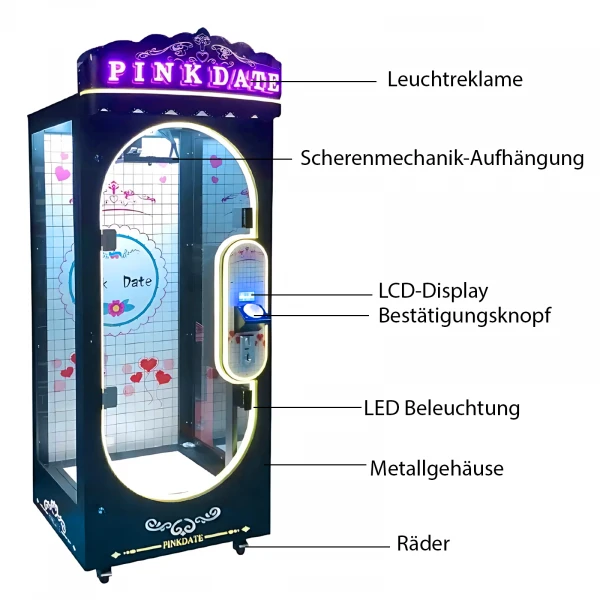 Erlebe den Kick des perfekten Timings! Steuere die Schere, schneide die Schnur durch und gewinne coole Preise. Mit stylischem Design, LED-Beleuchtung und transparenter Gewinnkammer ist der Pink Date Automat ein Muss für jeden, der Spannung und Spaß sucht. Perfekt für trendige Standorte und junge Zielgruppen.